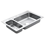 Moen 22823 Excalibur ESL-3322-4 Double Bowl Kitchen Sink, Stainless SteelMoen - Excalibur Series state of the art, new deadening Shield for Moen stainless steel sink is a dense undercoating material applied for exceptional noise reduction.Excalibur Sinks are the ultimate in luxury. Moen Excalibur offers the beauty, dependability and quality of stainless teel plus the special value of Moen Design. Moen 22823 Excalibur ESL-3322-4 Double Bowl Kitchen Sink, Stainless Steel Specifications:;Topmount Double Bowl Sink;Overall Dimension: 33" x 22";4 Hole Application;Small Bowl on Left;Large Bowl Dimesion: 21" x 16" x 6 3/8";Small Bowl Dimension: 7 1/2" x 16" x 5 1/2";22 gauge, type 301 Nickel-bearing Satinless Steel;5 Year Limited Warranty;U Channel Mounting; See related products for Details;See Undermount Installation Kit if needed for Application;Sink Dimensions are measured left-right x front-back;Please See Additional Information below for Specification and Installaion Manual.