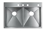 Kohler K-3820-4 Vault double-equal kitchen sink with four-hole faucet drilling, Stainless SteelThe new Vault sinks are dual-mount sinks that can also be used in a replacement application. The contemporary self-rimming Vault fabricated sink will appeal to customers who want a significantly differentiated sink without having to replace their countertops. The low-profile 1.25mm rim provides an undercounter or flush mount aesthetic, and makes wiping debris from the countertop directly into the sink basin easier than a typical self-rimming sink, 9" depths and tight corner radii maximize usable basin space, and the lowered saddle prevents water from overflowing into the countertop.Kohler K-3820-4 Vault double-equal kitchen sink with four-hole faucet drilling, Stainless Steel Features:; 33" x 22"; Constructed of 18-gauge stainless steel; Self-rimming or undercounter; Double equal basin