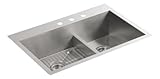 Kohler K-3838-3-NA Vault Smart Divide Double Equal Sink Three-Hole, Stainless SteelThe new Vault Smart Divide double equal sink is an innovative dual-mount sink, meaning the same sink can be installed as a self-rimming (above the countertop) or undercounter sink. When installed in a self-rimming application, the Vault fabricated sink is able to be used as a replacement sink in an existing cutout, appealing to customers who want a differentiated aesthetic without having to replace their countertops. Additionally, the low-profile 1.25mm rim provides a flush-mount functionality, making wiping debris from the countertop directly into the sink basin easier than a typical self-rimming sink. 9" deep basins and tight corner radii maximize usable basin space, while the innovative Smart Divide low-profile divider better accommodates large pots and helps keep water where it belongs.Kohler K-3838-3-NA Vault Smart Divide Double Equal Sink Three-Hole, Stainless Steel Features:; 33" x 22"; 9" Basin Depth; Constructed of 18-gauge stainless steel; Self-rimming or undercounter installation; Double equal basin; Includes one bottom basin rack that can be used in either basin; Smart Divide low-profile divider increases the clearance between faucet and divider, makes it easier to fit large items into the basins, increases the ability to transfer large items between basins, and minimizes splashing by containing water lower in the; Three-hole faucet drilling*Photo shows sink with 4-hole faucet drilling.